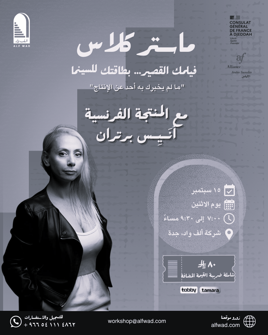 في هذا اللقاء الخاص، تستضيف شركة ألف واد المنتجة الفرنسية أنَيِس برتران، مؤسسة Insolence Productions والحائزة على جوائز عالمية مرموقة، للحديث عن أهمية صناعة الأفلام القصيرة ودورها في اكتشاف المواهب وبناء مسارات مهنية قوية. سيبدأ اللقاء بعرض فيلمين قصيرين، الأول سعودي والثاني من إنتاج أنَيِس، ليكونا مدخلًا للنقاش حول الاختلافات والتقاطعات بين التجربتين، ثم تنطلق الجلسة الحوارية التي ستديرها المخرجة والكاتبة السعودية فاطمة البنوي، لتناقش فيها الضيفة عن معنى إنتاج الأفلام القصيرة اليوم وعن التحديات والفرص والإمكانيات.